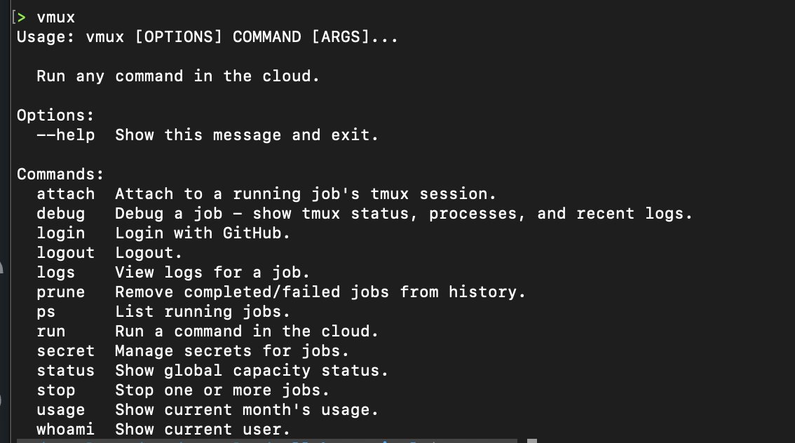Incredibly fast, stateful cloud sandboxes for coding agents. `vmux run` bundles and runs your code in a long-running Cloudflare container and gives you a preview URL in under 5 seconds. For agents — `vmux exec --create --gpu H100` spins up a Modal sandbox with persistent GPU/CPU access.